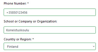 - Then enter your phone number and the name of your educational institution or company. Choose Country or Region and select Finland