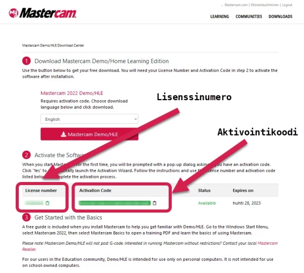 - You will receive the Mastercam student version license number and activation code. Copy both for later use, as they will be needed after installation when launching the software for the first time.