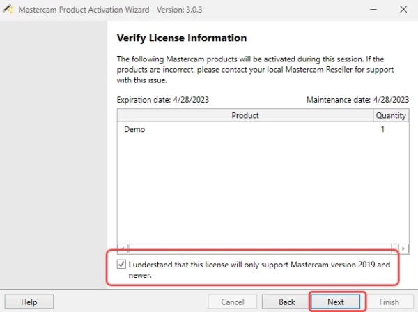 - The software will connect to the activation server again, then provide the license details for the student version. Check the box for I understand that this license will only support Mastercam version 2019 and newer and select Next.