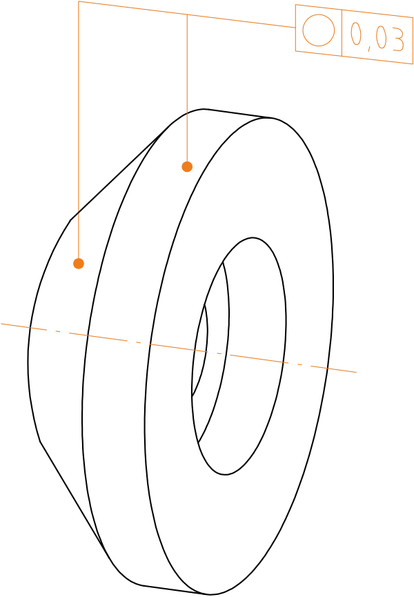 The tolerance zone is formed between two concentric circles, with a distance between them matching the tolerance indicated on the drawing. All points of the measured feature must lie between these circles. Unlike many other tolerances, circularity does not reference any datum, but pertains solely to the feature’s own shape.