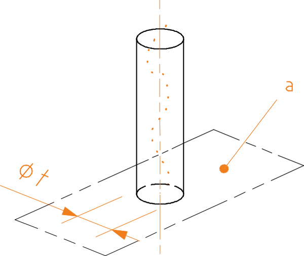 If a symbol is marked in front of the tolerance, the tolerance zone is defined by a cylinder of diameter t that is perpendicular to the datum feature.