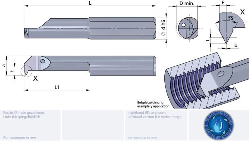 Whitworth thread, partial profile, internal with through coolant