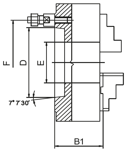Teräksinen keskittävä kolmileukaistukka kaksioisaisilla leuoilla.
