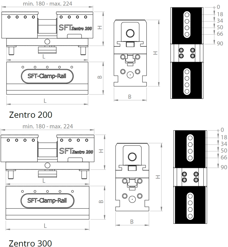 Zentro-keskittävä puristin sisä- ja ulkopuoliseen kiinnittämiseen, puristimessa on suojattu ruuvi. Zentroon on saatavana yli 30kpl erilaisia leukoja. SFT-matalakiinnittimet, kiskot sekä reikälevyt ovat yhteensopivia. Valmistusmaa Saksa, 5-vuoden takuu