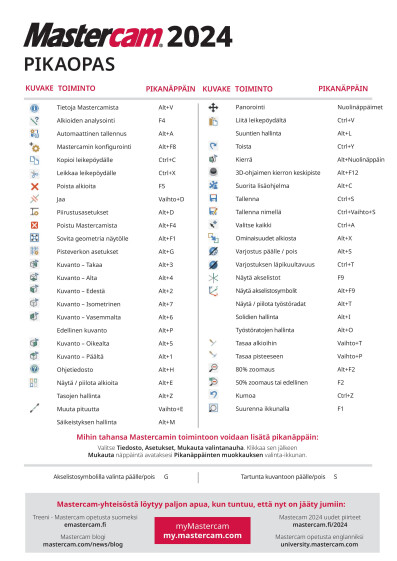 Camcutin oma tuotanto sisältää muun muassa dynaamisen jyrsinnän oppaan, joka syventyy nykyaikaisen jyrsintätekniikan menetelmiin ja sovelluksiin. Opas käy läpi työkalujen valinnan, työstöratojen optimoinnin ja käytännön suositukset tehokkaaseen ja kestävään koneistukseen. Lisäksi tarjolla on Mastercamin käyttöä helpottava pikaopas, joka kokoaa yhteen tärkeimmät pikanäppäimet ja käyttöliittymän hallintatyökalut, nopeuttaen päivittäistä ohjelmointityötä ja parantaen työn sujuvuutta.