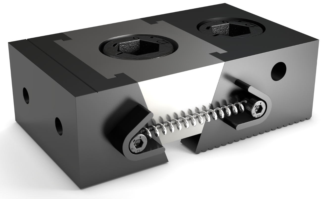 Matalakiinnitin jossa toinen leuka on kiinteä. Sileät leuat joissa kierrereiät lisäleukaa varten. Suojatuilla jousilla. Valmistusmaa Saksa, 5-vuoden takuu
