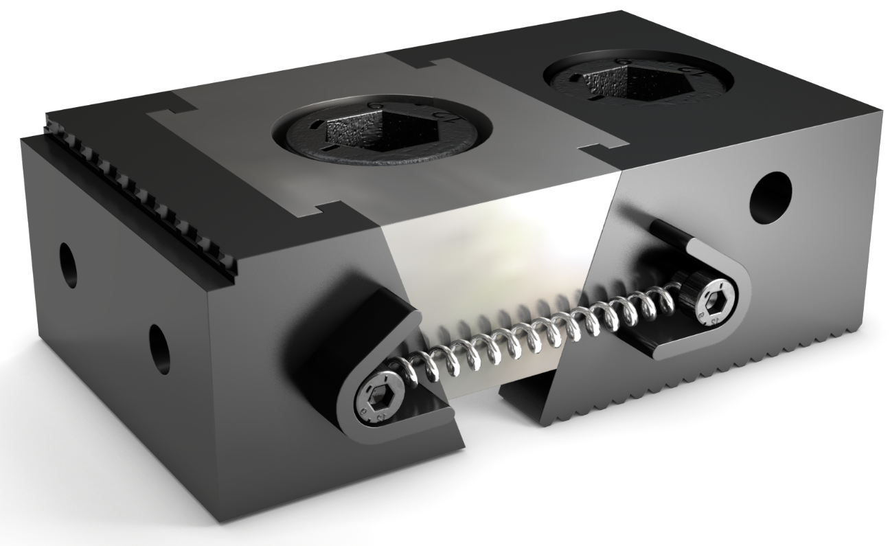 Matalakiinnitin jossa toinen leuka on kiinteä. Sileät leuat joissa kierrereiät lisäleukaa varten sekä porrastus leuan yläosassa. Suojatuilla jousilla. Valmistusmaa Saksa, 5-vuoden takuu