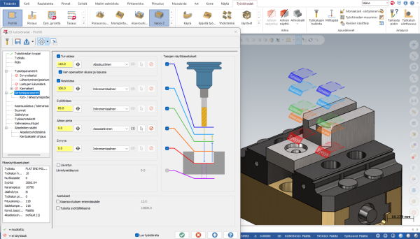 Mastercam 2024 versiossa esitellyt reikäoperaatioiden uudet siirtymisparametrit ovat nyt kaikissa nykyaikaisissa 2D työstöoperaatioissa. Uusia kehittyneitä siirtymisparametrejä voi hallita valikkojen lisäksi myös Mastercamin kuvaruutualueelta, jolloin eri työstötasojen korkeuksia voidaan siirtää helposti ja visuaalisesti. Graafisten tasojen näyttöjen avulla nähdään aina esikatselu valituista siirtymisparametreistä. Uudet siirtymisparametrit sisältävät myös aiemmin omalta välilehdeltä löytyneen ’lävistys’-valinnan, jonka ansiosta lävistys-valintaa ei tarvitse enää käydä erikseen määrittelemässä toisella välilehdellä.