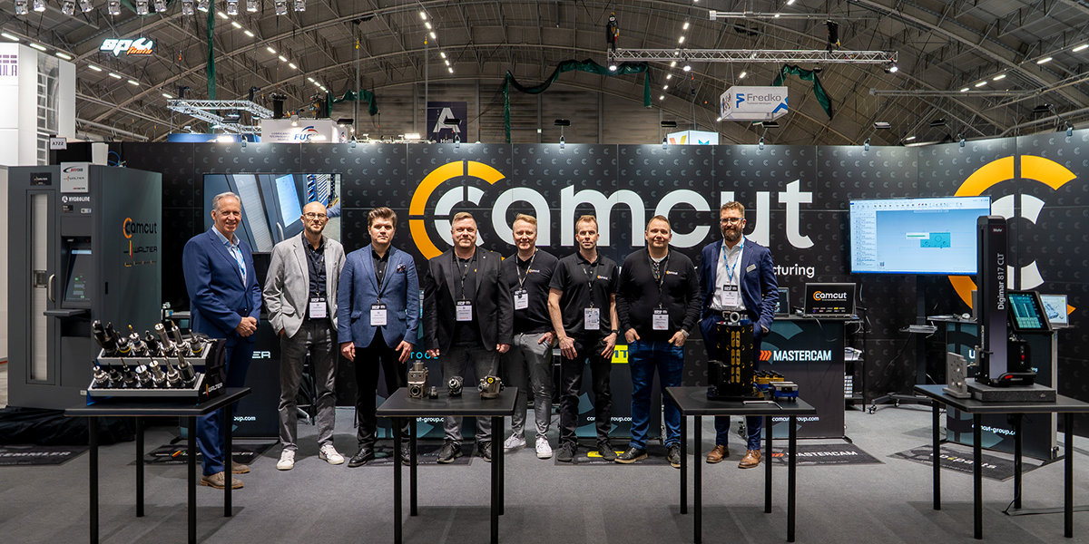 Messuilla palvellut asiantuntijatiimi (vasemmalta oikealle): Marcel Keus (SAV International Sales and Project Manager), Daniel Mutter (Product Owner, Toolhive), Andreas Mood (Toolhive / Sandvik), Mikko Vepsäläinen (CEO, Camcut), Janne Pesonen (COO, Camcut), Kimmo Keränen (Technical Sales Specialist, Camcut), Sampsa Hirvineva (Sales Engineer, Camcut), Marco Bauer (CEO, up2parts GmbH).