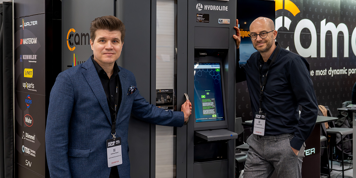 Andreas Mood ja Daniel Mutter esittelemässä Toolhiven integraatioita CRIBWISE:n Walter Toolstation TX750 -työkaluautomaattiin ja Mastercam-ohjelmistoon, jossa työkaludata yhdistyy suoraan osaksi tuotantoa ja CAM-ohjelmointia.