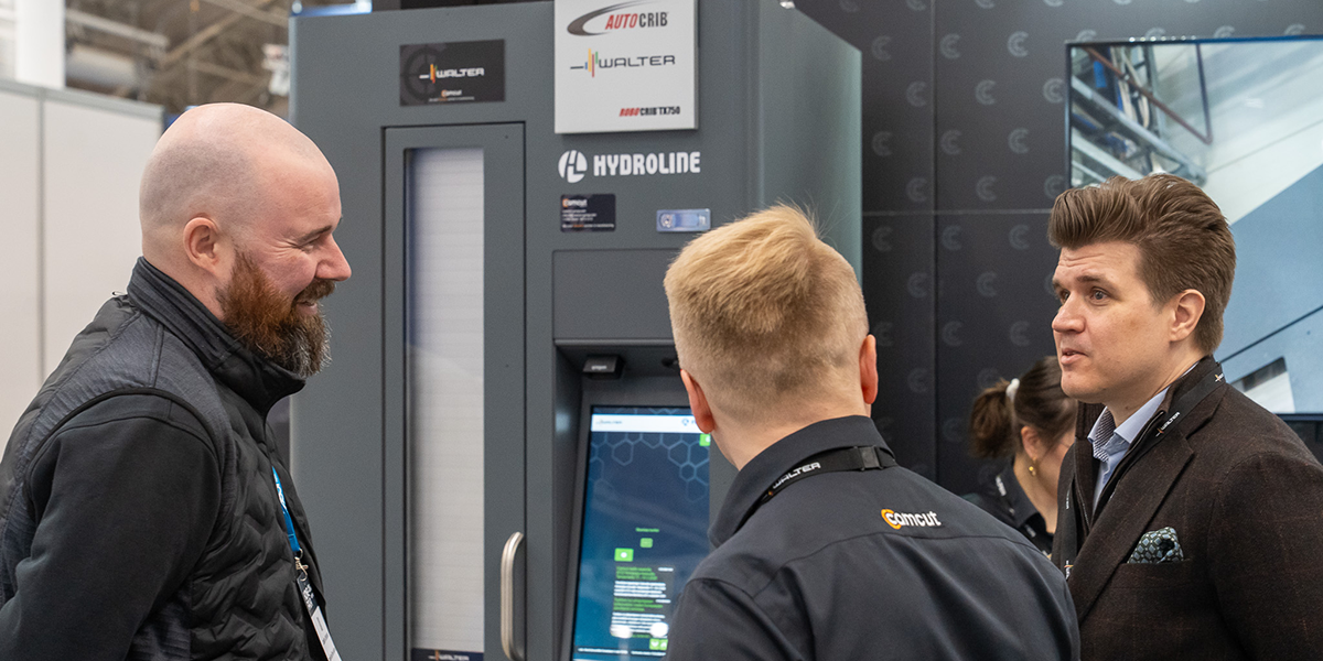 Joakim Johansson, Janne Pesonen ja Andreas Mood keskustelemassa CRIBWISE:n Walter Toolstation TX750 -työkaluautomaatin äärellä, joka siirtyi messujen jälkeen asiakaskäyttöön.