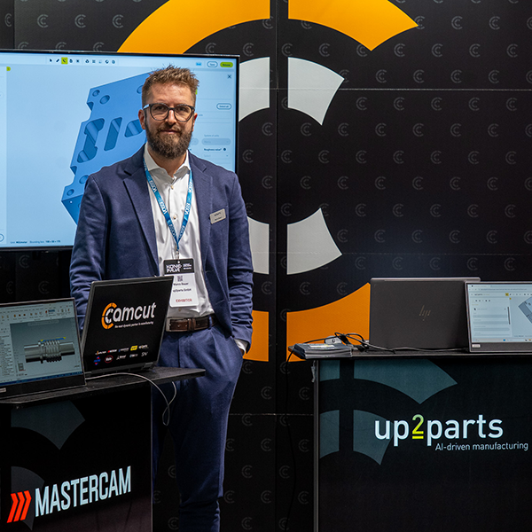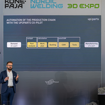 CAM-ohjelmoinnin rinnalla up2parts toi keskusteluun tekoälypohjaisen lähestymistavan tuotannon suunnitteluun ja ohjelmoinnin automatisointiin. Messuosastollamme vieraillut up2parts GmbH:n toimitusjohtaja Marco Bauer esitteli, miten tekoälyä voidaan hyödyntää tarjouslaskennassa, työnsuunnittelussa ja työstöratojen muodostamisessa konepajan omaan tuotantodataan perustuen.