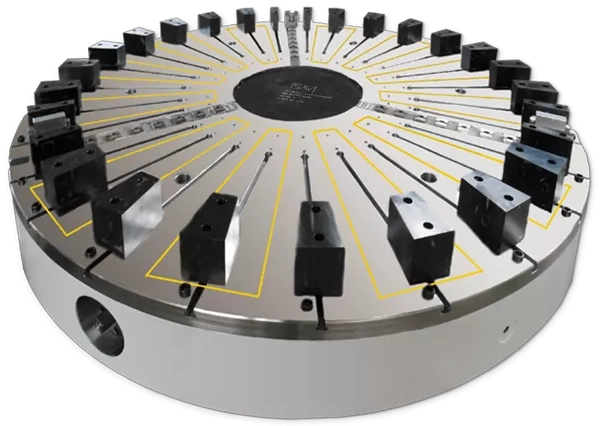 Den självcentrerande designen bygger på radiell polfördelning och TDG:s expertis inom stora hydrauliska backsystem. Det integrerade backsystemet centrerar automatiskt och repeterbart arbetsstycket. Fastspänningsnoggrannhet ner till 0,05 mm uppnås, och systemet passar för arbetsstycken mellan 450 mm och 7000 mm i diameter. Den kompakta designen, med en höjd från endast 170 millimeter, gör att modell 244.76 kan användas i stora svarvceller och horisontella bearbetningscenter.