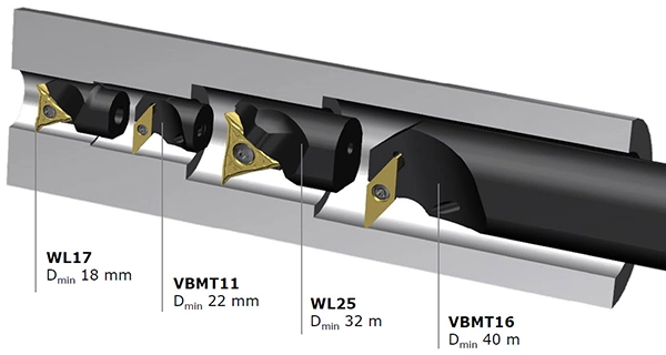 WL-skären finns i två storlekar. WL25 täcker standardsortimentet för både in- och utvändig svarvning. Typiska kopieringsvinklar och replikeringsvinklar ligger generellt mellan 30 och 50 grader, och WL-systemet stödjer även en neutral ansatsvinkel på 72,5 grader, vilket förenklar bearbetning av olika axelavsatser, fickor och spår både vid finish och medeltung svarvning. WL17 är designad för mindre diametrar, exempelvis längdsvarvar (Swiss-typ) och invändig svarvning. Den bygger på samma trekantsprincip med hög form- och spånavgång. WL17-skäret möjliggör invändig bearbetning ned till ett håldiameter på endast 18 mm och utökar därmed sitt användningsområde jämfört med konventionella V-typskär.